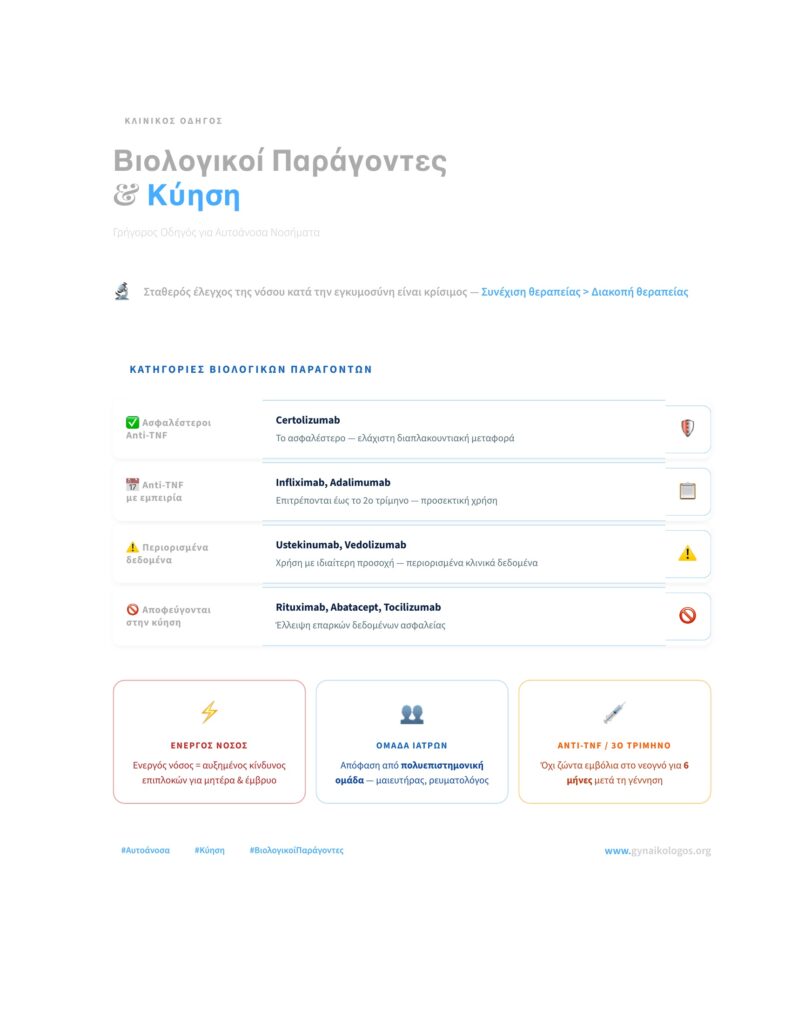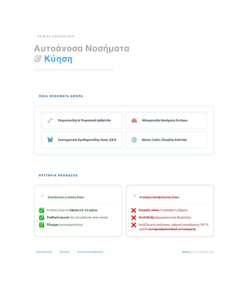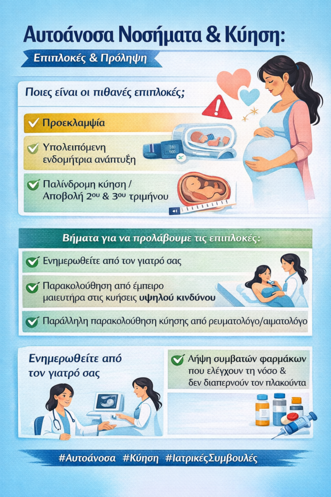 ⚕️ Σημαντικό: Μη διακόπτετε φαρμακευτική αγωγή χωρίς ιατρική συμβουλή. Στόχος είναι πάντα η ύφεση του αυτοάνοσου νοσήματος πριν ξεκινήσουν οι προσπάθειες για κύηση.